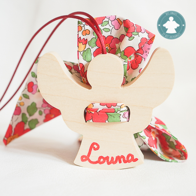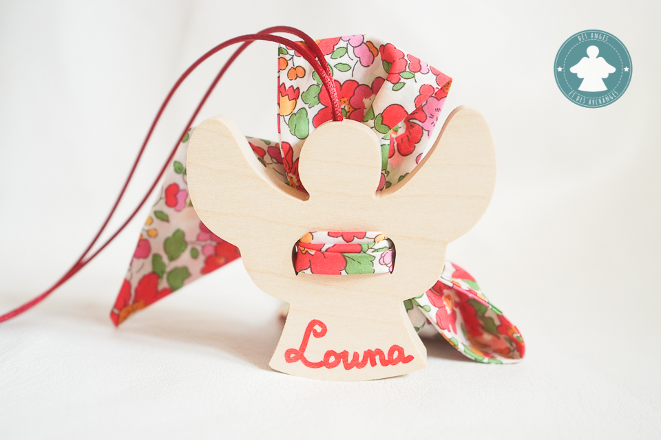 Mon bel ange en érable et liberty, à poser ou à suspendre. Taille : 9cm